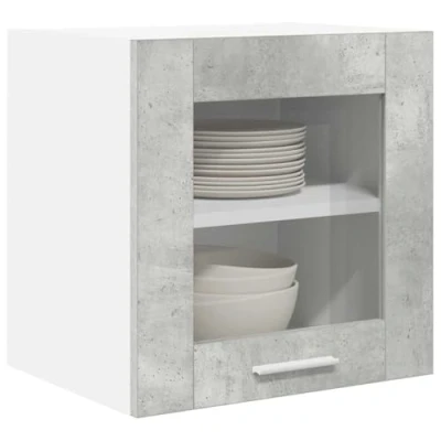 ManoManoGeneral description This modern kitchen wall cabinet perfectly complements contemporary spaces. It features a sleek, rectangular design that updates the look of your kitchen while offering essential storage solutions. Crafted from high-quality engineered wood, its stain-resistant finish ensures effortless maintenance while adding a touch of sophistication to your cooking area. Technical specifications Material: Engineered wood Colour: Concrete grey Overall dimensions: 40 x 31 x 40 cm (L x W x H) Weight: 16.8 kg Frame material: Engineered wood With 1 hinge door Indoor use only Included Components 2 x Hanging glass cabinet 2 shelves Finished back panels Assembly required: Yes Mounting included: Wall/ceiling fixtures (specific screws or wall plugs not included) Usage Designed specifically for kitchen environments, this cabinet suits modern lifestyles by providing effective storage without compromising on style or space. The wall-mounted construction saves valuable floor space, while the