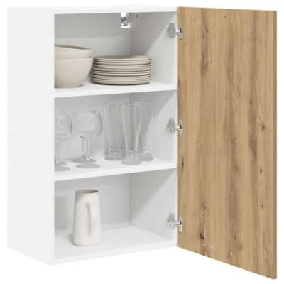 ManoManoGeneral description This modern kitchen wall cabinet is designed to enhance contemporary spaces. With its sleek, rectangular design, it updates the look of your kitchen while providing essential storage solutions. Crafted from high-quality engineered wood, its stain-resistant finish ensures effortless maintenance and adds a touch of sophistication to your cooking area. Technical specifications Material: Engineered wood Colour: Artisan oak and white Overall dimensions: 50 x 31 x 80 cm (L x W x H) Weight: 16.7 kg Features: 3 shelves, 1 hinge door Compatibility and accessories Indoor use only Mounting included: Wall/ceiling fixtures (specific screws or wall plugs not included) Installation Assembly required: Yes Usage Recommended for kitchen environments, providing effective storage without compromising on style or space. Other information