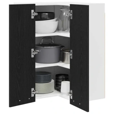 ManoManoGeneral description This modern kitchen wall cabinet perfectly complements contemporary spaces. It features a sleek, rectangular design that updates the look of your kitchen while offering essential storage solutions. Crafted from engineered wood, its stain-resistant finish ensures effortless maintenance while adding a touch of sophistication to your cooking area. Technical specifications Material: Engineered wood Colour: Black oak and white Overall dimensions: 57 x 57 x 80 cm (L x W x H) Weight: 25.8 kg Frame material: Engineered wood Indoor use only Included Components: Finished back panels and durable board shelves Number of shelves: 3 Installation Assembly required: Yes Mounting included: Wall/ceiling fixtures (specific screws or wall plugs not included) Usage This cabinet is designed specifically for kitchen environments, providing effective storage without compromising on style or space. The wall-mounted construction saves valuable floor space, while the durable engineered wood