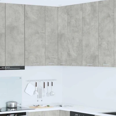 ManoManoGeneral description This modern kitchen wall cabinet in concrete grey and white is designed to enhance contemporary spaces. Its sleek, rectangular design not only updates the look of your kitchen but also provides essential storage solutions. Crafted from high-quality engineered wood, the cabinet features a stain-resistant finish for effortless maintenance, adding a touch of sophistication to your cooking area. Technical specifications Material: Engineered wood Overall dimensions: 57 x 57 x 100 cm (L x W x H) Weight: 27.79 kg Colour: Concrete grey and white Number of shelves: 3 Number of doors: 2 Indoor use only Included Components 1 x Hanging Corner Cabinet Finished back panels Durable board shelves Installation Assembly required: Yes Mounting included: Wall/ceiling fixtures (specific screws or wall plugs not included) Usage This cabinet is specifically designed for kitchen environments, providing effective storage solutions without compromising on style or space. Its wall-mounted