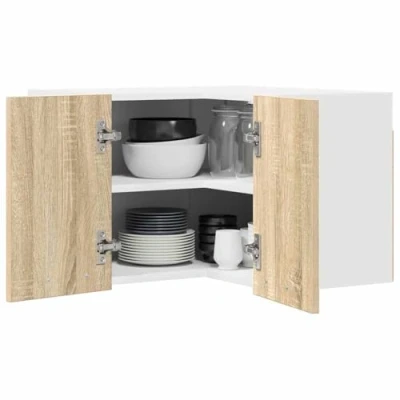 ManoManoGeneral description This modern kitchen wall cabinet is designed to enhance contemporary spaces with its sleek, rectangular design. It not only updates the look of your kitchen but also provides essential storage solutions. Crafted from high-quality engineered wood, its stain-resistant finish ensures easy maintenance while adding sophistication to your cooking area. Technical specifications Material: Engineered wood Colour: Sonoma oak and white Overall dimensions: 57 x 57 x 40 cm (L x W x H) Weight: 15.8 kg Frame material: Engineered wood Indoor use only Included components: Finished back panels and durable board shelves Assembly required: Yes Mounting included: Wall/ceiling fixtures (specific screws or wall plugs not included) Range name: Riga EAN: 8721359450774 SKU: 884188 Usage Recommended for kitchen environments, providing effective storage without compromising on style or space. Keep the cabinet looking fresh with simple maintenance; wipe with a damp cloth regularly. Other