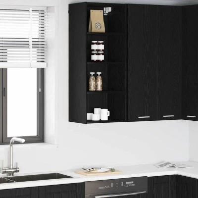 ManoManoGeneral description This modern kitchen wall cabinet in Black Oak is designed to enhance contemporary spaces. With its sleek, rectangular design, it not only updates the look of your kitchen but also provides essential storage solutions. Crafted from high-quality engineered wood, the cabinet features a stain-resistant finish for easy maintenance, adding a touch of sophistication to your cooking area. Technical specifications Material: Engineered wood Overall dimensions: 40 x 29.5 x 100 cm (L x W x H) Weight: 12.97 kg Color: Black oak Number of shelves: 3 Indoor/outdoor: Indoor use only Compatibility and accessories Included Components: Finished back panels and durable board shelves Mounting: Wall/ceiling fixtures (specific screws or wall plugs not included) Installation Assembly required: Yes Usage Recommended for kitchen environments, providing effective storage without compromising on style or space. Other information