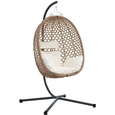 This Hanging Egg Chair Basket with Stand brings a contemporary flair to personal relaxation spaces. It's tailored for those who treasure moments of solitude, featuring a clean, modern aesthetic that integrates seamlessly into any environment. Perfectly suited for living rooms, balconies, gardens, or terraces, this piece offers a serene spot amid the bustle of daily life. The chair’s elliptical shape cradles you in comfort, while the robust poly rattan construction promises a stable and supportive lounging experience. Accompanied by plush cushioning, it's the perfect oasis for unwinding after a long day. Durable Poly Rattan Structure: This hanging egg chair is constructed from premium poly rattan, a material esteemed for its lightweight nature and weather resistance. It ensures that the chair can withstand both the elements outdoors and daily indoor use, offering a dependable seating solution for the summer months. The durable material requires minimal maintenance, allowing you to enjoy more time relaxing rather than upkeeping. Ergonomic Design Benefits: Designed with comfort in mind, the elliptical form of the hanging egg chair envelops users, providing an ergonomic seating experience that aids in relieving pressure points while encouraging proper posture. This design ensures not only a comforting seat but also prevention of discomfort after prolonged sitting, making it perfect for leisure and relaxation. Space-Saving Foldable Feature: The chair's smart foldable design allows easy storage or transport, making it an excellent choice for those who regularly rearrange their space or move between locations. It can collapse into a compact form, reducing the clutter in your living area or freeing up space on your balcony when it's not in use. Versatile Placement Options: Suitable for use in a variety of settings, this hanging egg chair ensures that no matter where you decide to relax –be it an indoor living room or a sunlit garden terrace –the chair provides a stylish and functional seating arrangement. Its modern styling complements a range of decor, offering flexibility in personalizing your space. Essential Components Included: The hanging egg chair comes complete with a secure stand, headrest, and a plush cushion for superior comfort. These elements guarantee stability and comfort, providing everything needed to immediately enjoy the benefits of this seat from day one without the need for additional purchases.