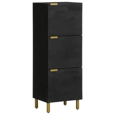 General description This highboard offers both decorative appeal and practical storage, making it a perfect addition to your home. Technical specifications Colour: Black Material: Engineered wood, solid mango wood, brass Overall dimensions: 40 x 33 x 110 cm (L x W x H) Feet height: 10 cm Assembly required: Yes Usage Stable and durable material: Engineered wood is a durable and stable material with a smooth surface that is resistant to moisture, warping, and splitting. Practical handles: The side cabinet comes with handles that provide a comfortable grip for easy opening and closing. Sturdy tabletop: The tall storage cabinet features a sturdy tabletop for placing decorative items, photo albums, or small plants. Metal feet: The metal feet add a calm style to your interior while ensuring stability. Easy to maintain: The smooth surface allows for easy cleaning with a damp cloth. Other information Warning: To prevent it from tipping over, this product must be used with the provided wall