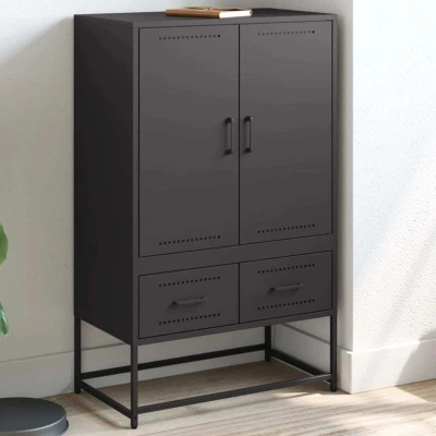 ManoManoGeneral description This stylish highboard adds an elegant charm to your existing interior. Made from durable cold-rolled steel, it offers sturdiness and stability while providing ample storage space for magazines, books, remote controls, and other small items, keeping them well-organized and within reach. The cabinet is easy to maintain and can be cleaned with a damp cloth. Technical specifications Color: Black Material: Cold-rolled steel Dimensions: 68 x 39 x 111.5 cm (L x W x H) With 2 doors With 2 drawers Assembly required: Yes Other information Warning: To prevent it from tipping over, this product must be used with the wall attachment device (not provided). SKU: 846608