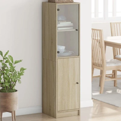 ManoManoGeneral description This stylish highboard adds an elegant charm to your existing interior. It features a practical glass door that allows you to display items beautifully while keeping your space clutter-free by hiding small essentials behind the cupboard doors. Technical specifications Colour: Sonoma oak Material: Engineered wood, glass Dimensions: 35 x 37 x 142 cm (W x D x H) Max. load capacity: 60 kg Load capacity of compartment: 20 kg Assembly required: Yes Number of compartments: 4 Other information To prevent it from being overturned, this product must be used with the provided wall attachment device.
