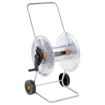 ManoManoGeneral description This hose reel cart provides a compact storage solution to keep hoses organized and effectively prevent tangling. The combination of a longer towing handle and integrated wheels ensures the reel moves easily around your garden. Its stable and durable construction, made from galvanized steel, offers resistance to corrosion and harsh weather conditions, ensuring long-lasting performance. The angled hose connection prevents hose twisting and kinking for convenient operation. Technical specifications Colour: Silver and black Material: Galvanized steel and plastic Drum diameter: 40 cm Drum width: 30 cm Stores up to 80 m of 1/2" or 50 m of 3/4" garden hose Assembly required: Yes SKU: 4005281 Other information