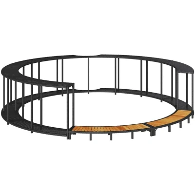 ManoManoGeneral description Enhance the spa experience for you and your guests with this stylish hot tub surround. This versatile accessory creates a more practical and user-friendly spa area while providing a stylish look for your relaxation space. Technical specifications Colour: Black Material: PE rattan, powder-coated steel, solid acacia wood Outer dimensions: 243 x 55 cm (Diameter x H) Inner dimensions: 203 x 55 cm (Diameter x H) Panel width: 20 cm Size of cutout for power pack: 47 x 13 cm (L x W) Wooden step dimensions: 76/91 x 20 x 11 cm (L x W x H) Includes 2 wooden spa steps UV-resistant Assembly required: Yes Compatibility and accessories This hot tub surround is designed for portable spas and includes a built-in storage area with a cutout section for the power pack, providing ample storage space for your essentials. Installation Assembly is required for this product. Please follow the included instructions for proper setup. Usage The surface of the outdoor hot tub enclosure can