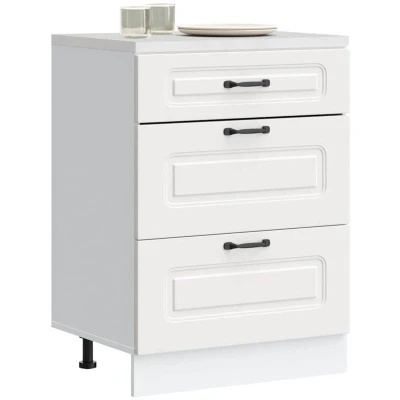 ManoManoGeneral description This kitchen base cabinet optimizes your kitchen space, providing ample storage for your personal belongings. It features practical doors that help maintain a clean and organized area by concealing kitchen appliances and clutter. Technical specifications Colour: White Material: Engineered wood Overall dimensions: 60 x 46 x 81.5 cm (W x D x H) Dimension of drawer (L): 51.5 x 38.5 x 16 cm (W x D x H) Drawer dimensions (S): 51.5 x 38.5 x 27 cm (W x D x H) Range name: Kalmar With adjustable feet The worktop is not included in the delivery Assembly required: Yes SKU: 854279 Compatibility and accessories Screw(s) and plug(s) for inside the wall are not included. Seek and use screw(s) and plug(s) suitable for your walls. Installation In order to prevent overturning, this product must be used with the wall attachment device provided. If you are uncertain, seek professional advice. Read and follow each step of the instruction carefully. Usage Easy to maintain: Thanks to its