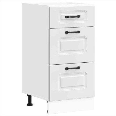 ManoManoGeneral description This kitchen base cabinet optimizes your kitchen space, providing ample storage for your personal belongings. It features practical doors that help maintain a clean and organized area by concealing kitchen appliances and clutter. Technical specifications Colour: White Material: Engineered wood Overall dimensions: 40 x 46 x 81.5 cm (W x D x H) Dimension of drawer (L): 31.5 x 38.5 x 16 cm (W x D x H) Drawer dimensions (S): 31.5 x 38.5 x 27 cm (W x D x H) Range name: Kalmar With adjustable feet The worktop is not included in the delivery Assembly required: Yes SKU: 854240 Compatibility and accessories Screw(s) and plug(s) for inside the wall are not included. Seek and use screw(s) and plug(s) suitable for your walls. Installation In order to prevent overturning, this product must be used with the wall attachment device provided. If you are uncertain, seek professional advice. Read and follow each step of the instruction carefully. Usage Easy to maintain: Thanks to its