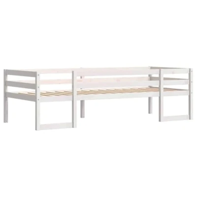 ManoManoGeneral description Dream a dream with this wooden kids' bed frame. Featuring an elegant and timeless design, it is the perfect choice for your kids! The bed frame is made from solid pinewood, known for its strength and durability, and includes safety guardrails on all four sides to prevent falls during sleep. The ample space underneath the bed allows for storage or play, making it a practical addition to any child's room. Technical specifications Colour: White Frame material: Solid pinewood Slat frame material: Plywood Overall dimensions: 195.5 x 97.5 x 61 cm (L x W x H) Suitable mattress size: 90 x 190 cm (W x L) (mattress not included) Suitable for children aged 4 years and above Assembly required: Yes SKU: 846868 Usage The bed frame is designed for children aged 4 years and above, providing a safe and comfortable sleeping environment. It is suitable for use with a standard mattress size of 90 x 190 cm, which is not included with the bed frame. Other information To prevent tipping,