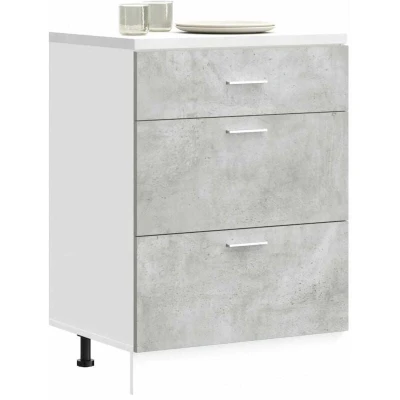 ManoManoGeneral description This kitchen base cabinet optimizes your kitchen space, providing ample storage for your personal belongings. It is designed with a modern concrete grey finish, making it a stylish addition to any kitchen. Technical specifications Colour: Concrete grey Material: Engineered wood Overall dimensions: 60 x 46 x 81.5 cm (W x D x H) Dimensions of each drawer: 60 x 38.5 x 16/27 cm (W x D x H) Maximum weight capacity: 50 kg Weight capacity of each drawer: 5-8 kg With adjustable feet Assembly required: Yes Installation To prevent tipping, this product must be used with the provided wall attachment device. Screws and plugs for wall attachment are not included; use suitable ones for your walls. If uncertain, seek professional advice. Read and follow each step of the instruction carefully. Usage Ample storage space for bowls, plates, pots, and other kitchen appliances. Easy to maintain; clean with a damp cloth. Other information