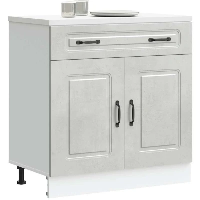 ManoManoGeneral description This kitchen base cabinet optimizes your kitchen space, providing ample storage for your personal belongings. It features practical doors that help maintain a clean and organized area by concealing kitchen appliances and clutter. Technical specifications Colour: Concrete grey Material: Engineered wood Overall dimensions: 80 x 46 x 81.5 cm (W x D x H) Drawer dimensions: 80 x 38.5 x 16 cm (W x D x H) Cabinet dimensions: 77 x 46 x 54 cm (W x D x H) Maximum weight capacity: 60 kg Weight capacity per layer: 25 kg Range name: Kalmar With adjustable feet Assembly required: Yes The worktop is not included in the delivery Installation To prevent tipping, this product must be used with the provided wall attachment device. Screw(s) and plug(s) for inside the wall are not included; seek suitable options for your walls. If uncertain, seek professional advice and read each step of the instructions carefully. Usage This kitchen base cabinet is designed for storing bowls, plates,
