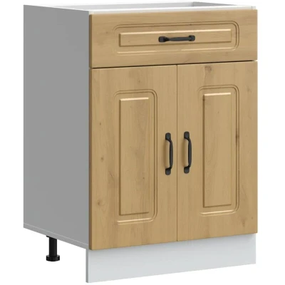ManoManoGeneral description This kitchen base cabinet optimizes your kitchen space, providing ample storage for your personal belongings. It features practical doors that help maintain a clean and organized area by concealing kitchen appliances and clutter. Technical specifications Colour: Artisan oak Material: Engineered wood Overall dimensions: 60 x 46 x 81.5 cm (W x D x H) Drawer dimensions: 60 x 38.5 x 16 cm (W x D x H) Cabinet dimensions: 57 x 46 x 54 cm (W x D x H) Maximum weight capacity: 60 kg Weight capacity per layer: 25 kg Range name: Kalmar With adjustable feet The worktop is not included in the delivery Assembly required: Yes Installation To prevent tipping, this product must be used with the provided wall attachment device. Screw(s) and plug(s) for inside the wall are not included; seek and use suitable screw(s) and plug(s) for your walls. If uncertain, seek professional advice. Read and follow each step of the instruction carefully. Usage Easy to maintain: Thanks to its smooth