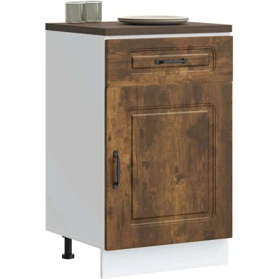ManoManoGeneral description This kitchen base cabinet optimizes your kitchen space, providing ample storage for your personal belongings. It features a practical door that helps maintain a clean and organized area by concealing kitchen appliances and clutter. Technical specifications Colour: Smoked oak Material: Engineered wood Overall dimensions: 50 x 46 x 81.5 cm (W x D x H) Drawer dimensions: 50 x 38.5 x 16 cm (W x D x H) Cabinet dimensions: 50 x 46 x 54 cm (W x D x H) Maximum weight capacity: 50 kg Weight capacity per layer: 20 kg Range name: Kalmar With adjustable feet The worktop is not included in the delivery Assembly required: Yes SKU: 853482 Installation To prevent tipping, this product must be used with the provided wall attachment device. Screw(s) and plug(s) for inside the wall are not included; seek and use suitable screw(s) and plug(s) for your walls. If uncertain, seek professional advice. Read and follow each step of the instruction carefully. Usage Easy to maintain: Thanks