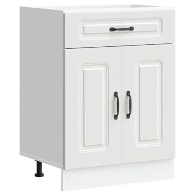 ManoManoGeneral description This kitchen base cabinet optimizes your kitchen space, providing ample storage for your personal belongings. It features practical doors that help maintain a clean and organized area by concealing kitchen appliances and clutter. Technical specifications Colour: White Material: Engineered wood Overall dimensions: 60 x 46 x 81.5 cm (W x D x H) Drawer dimensions: 60 x 38.5 x 16 cm Cabinet dimensions: 57 x 46 x 54 cm (W x D x H) Maximum weight capacity: 60 kg Weight capacity per layer: 25 kg Range name: Kalmar With adjustable feet The worktop is not included in the delivery Assembly required: Yes SKU: 853487 Compatibility and accessories Screw(s) and plug(s) for inside the wall are not included. Seek and use screw(s) and plug(s) suitable for your walls. Installation To prevent tipping, this product must be used with the provided wall attachment device. If uncertain, seek professional advice. Read and follow each step of the instruction carefully. Usage Easy to
