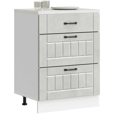 ManoManoGeneral description This kitchen base cabinet optimizes your kitchen space, providing ample storage for your personal belongings. It is designed to be stable and durable, made from engineered wood that is resistant to moisture, warping, and splitting. Technical specifications Colour: Concrete grey Material: Engineered wood Overall dimensions: 60 x 46 x 81.5 cm (W x D x H) Dimensions of each drawer: 60 x 38.5 x 16/27 cm (W x D x H) Maximum weight capacity: 50 kg Weight capacity per drawer: 5-8 kg Range name: Lucca With adjustable feet Assembly required: Yes Installation To prevent tipping, this product must be used with the provided wall attachment device. Screw(s) and plug(s) for inside the wall are not included; use suitable ones for your walls. If uncertain, seek professional advice. Read and follow each step of the instruction carefully. Usage Ample storage space for bowls, plates, pots, and other kitchen appliances. Easy to maintain with a damp cloth due to its smooth surface.