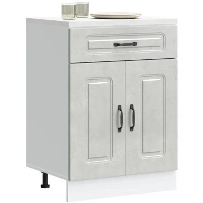 ManoManoGeneral description This kitchen base cabinet optimizes your kitchen space, providing ample storage for your personal belongings. It features practical doors that help maintain a clean and organized area by concealing kitchen appliances and clutter. Technical specifications Colour: Concrete grey Material: Engineered wood Overall dimensions: 60 x 46 x 81.5 cm (W x D x H) Drawer dimensions: 60 x 38.5 x 16 cm Cabinet dimensions: 57 x 46 x 54 cm (W x D x H) Maximum weight capacity: 60 kg Weight capacity per layer: 25 kg Range name: Kalmar With adjustable feet The worktop is not included in the delivery Assembly required: Yes Installation To prevent tipping, this product must be used with the provided wall attachment device. Screw(s) and plug(s) for inside the wall are not included; seek and use suitable screw(s) and plug(s) for your walls. If uncertain, seek professional advice. Read and follow each step of the instruction carefully. Usage Easy to maintain: Thanks to its smooth surface,