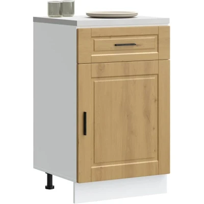 ManoManoGeneral description This kitchen base cabinet optimizes your kitchen space, providing ample storage for your personal belongings. It features practical doors that help maintain a clean and organized area by concealing kitchen appliances and clutter. Technical specifications Colour: Artisan oak Material: Engineered wood Overall dimensions: 50 x 46 x 81.5 cm (W x D x H) Drawer dimensions: 50 x 38.5 x 16 cm (W x D x H) Cabinet dimensions: 50 x 46 x 54 cm (W x D x H) Maximum weight capacity: 65 kg Weight capacity per layer: 20 kg Range name: Porto With adjustable feet The worktop is not included in the delivery Assembly required: Yes Installation To prevent tipping, this product must be used with the provided wall attachment device. Screw(s) and plug(s) for inside the wall are not included; seek and use suitable screw(s) and plug(s) for your walls. If uncertain, seek professional advice. Read and follow each step of the instruction carefully. Usage Easy to maintain: Thanks to its smooth