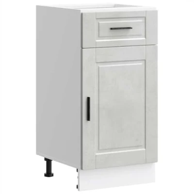 ManoManoGeneral description This kitchen base cabinet optimizes your kitchen space, providing ample storage for your personal belongings. It features practical doors that help maintain a clean and organized area by concealing kitchen appliances and clutter. Technical specifications Colour: Concrete grey Material: Engineered wood Overall dimensions: 40 x 46 x 81.5 cm (W x D x H) Drawer dimensions: 40 x 38.5 x 16 cm (W x D x H) Cabinet dimensions: 40 x 46 x 54 cm (W x D x H) Maximum weight capacity: 60 kg Weight capacity per layer: 20 kg Range name: Porto With adjustable feet The worktop is not included in the delivery Assembly required: Yes Installation To prevent tipping, this product must be used with the provided wall attachment device. Screw(s) and plug(s) for inside the wall are not included; seek and use suitable screw(s) and plug(s) for your walls. If uncertain, seek professional advice. Read and follow each step of the instruction carefully. Usage Easy to maintain: Thanks to its smooth