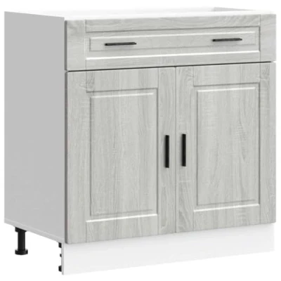 ManoManoGeneral description This kitchen base cabinet optimizes your kitchen space, providing ample storage for your personal belongings. It features practical doors that help maintain a clean and organized area by concealing kitchen appliances and clutter. Technical specifications Colour: Grey sonoma Material: Engineered wood Overall dimensions: 80 x 46 x 81.5 cm (W x D x H) Drawer dimensions: 80 x 38.5 x 16 cm (W x D x H) Cabinet dimensions: 77 x 46 x 54 cm (W x D x H) Maximum weight capacity: 70 kg Weight capacity per layer: 25 kg Range name: Porto With adjustable feet The worktop is not included in the delivery Assembly required: Yes Installation To prevent tipping, this product must be used with the provided wall attachment device. Screw(s) and plug(s) for inside the wall are not included; seek and use suitable screw(s) and plug(s) for your walls. If uncertain, seek professional advice. Read and follow each step of the instruction carefully. Usage Easy to maintain: Thanks to its smooth