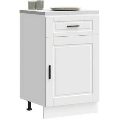 ManoManoGeneral description This kitchen base cabinet optimizes your kitchen space, providing ample storage for your personal belongings. It features practical doors that help maintain a clean and organized area by concealing kitchen appliances and clutter. Technical specifications Colour: White Material: Engineered wood Overall dimensions: 50 x 46 x 81.5 cm (W x D x H) Drawer dimensions: 50 x 38.5 x 16 cm (W x D x H) Cabinet dimensions: 50 x 46 x 54 cm (W x D x H) Maximum weight capacity: 65 kg Weight capacity per layer: 20 kg Range name: Porto With adjustable feet The worktop is not included in the delivery Assembly required: Yes SKU: 853957 Compatibility and accessories Screw(s) and plug(s) for inside the wall are not included. Seek and use screw(s) and plug(s) suitable for your walls. Installation To prevent tipping, this product must be used with the provided wall attachment device. If uncertain, seek professional advice. Read and follow each step of the instruction carefully. Usage Easy