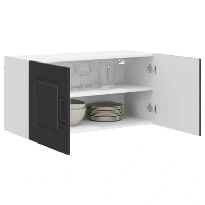 ManoManoGeneral description This Kitchen Wall Cabinet adds a modern touch to your kitchen space while offering ample storage solutions to keep your kitchen organized and tidy. Its clean lines and black frame bring a sense of minimalism and functionality, making it suitable for various kitchen decors. Perfect for storing tableware, cooking ingredients, or other kitchen essentials, this wall cabinet combines function with a sleek design, enhancing any culinary environment. Technical specifications Colour: Black Material: Engineered wood Overall dimensions: 80 x 31 x 40 cm (W x D x H) Weight: 13.91 kg With 2 shelves With 2 doors Indoor use only Included Components 1 x Kitchen wall cabinet Wall/ceiling fixtures included (specific screws or wall plugs not included) Installation Assembly required: Yes Use a screwdriver following the manufacturer's instructions for assembly. Ensure screws suited for your wall type are used during installation for stability. Usage Ideal for storing utensils, food