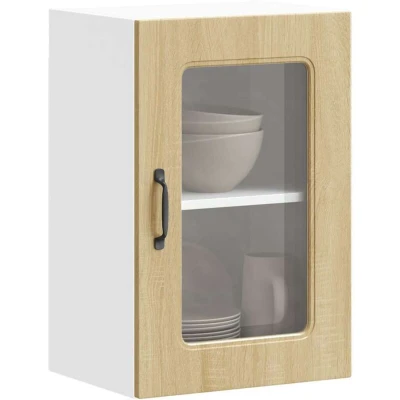 ManoManoGeneral description This kitchen wall cabinet optimizes your kitchen space, providing ample storage for your personal belongings. It features a practical glass door that helps maintain a clean and organized area by concealing kitchen appliances and clutter. Technical specifications Colour: Sonoma oak Material: Engineered wood and glass Overall dimensions: 40 x 31 x 60 cm (W x D x H) Dimensions of each compartment: 37 x 29.5 x 27.5 cm (W x D x H) Maximum weight capacity: 50 kg Assembly required: Yes Installation To prevent tipping, this product must be used with the provided wall attachment device. Screw(s) and plug(s) for inside the wall are not included; seek and use suitable screw(s) and plug(s) for your walls. If uncertain, seek professional advice and read each step of the instruction carefully. Usage Easy to maintain: The smooth surface allows for easy cleaning with a damp cloth and requires less maintenance. Wide applications: This cabinet is versatile and suitable for use in