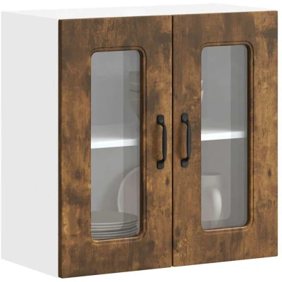 ManoManoGeneral description This kitchen wall cabinet is designed to optimize your kitchen space while adding a decorative touch to your home. Its wall-mounted design maximizes floor space and keeps the area tidy, making it a practical addition to any kitchen. Technical specifications Color: Smoked oak Material: Engineered wood and glass Overall dimensions: 60 x 31 x 60 cm (W x D x H) Dimensions of each shelf: 57 x 29.5 x 27.5 cm (W x D x H) Maximum load capacity (total): 70 kg Assembly required: Yes SKU: 853672 Installation Screws and plugs for wall mounting are not included; use suitable ones for your walls. If uncertain, seek professional advice. Read and follow each step of the instructions carefully. Usage Ample storage space for bowls, plates, pots, and other kitchen appliances. The glass door provides visibility while keeping the contents organized and concealed. Easy to maintain with a smooth surface that can be cleaned with a damp cloth. Other information