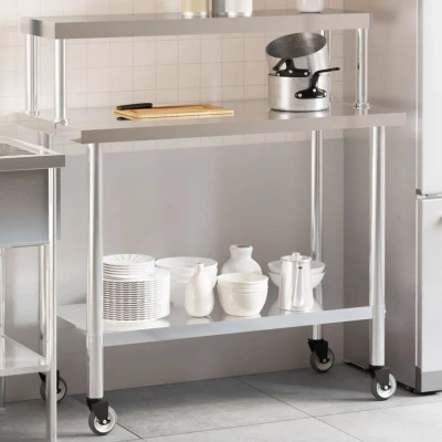 VidaXLThis kitchen work table is perfect for food prep and storage and is ideal for a kitchen bar, restaurant, school, as well as other commercial places. Durable and stable construction: The work table is made of stainless steel, providing resistance to corrosion and rust for years of reliable use. The smooth surface is easy to clean and maintain, ensuring a hygienic food preparation area.Ample workplace: The stainless steel prep table is designed with a bottom shelf and a overshelf for customised storage space, providing ample storage space for your microwave oven, kitchen utensils, or any other tools you may need.Flexible movement: The prep table comes with 4 wheels, making it easy and convenient to roll it wherever you need it. Additionally, 2 wheels are lockable for added control and safety. Warning:To prevent it from tipping over, this product must be used with the provided wall attachment device.