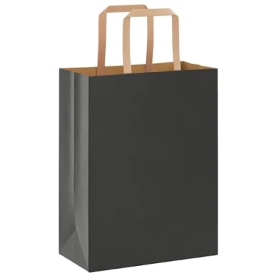 ManoManoGeneral description The paper bags offer a sustainable packaging option for a wide variety of uses. Made from durable and recyclable kraft paper, these bags provide an eco-friendly alternative to plastic bags, helping to reduce plastic waste while being able to withstand everyday use. Technical specifications Colour: Black Handle colour: Brown Material: 100g/sqm kraft paper Dimensions (without handles): 21 x 11 x 28 cm (L x W x H) Max. weight capacity (each): 6 kg With paper rope handles Delivery contains: 250 x Paper bag Usage The adaptability of kraft paper bags makes them suitable for various applications, including: Gift bags Party bags Shopping bags Takeaway bags Waste bags These bags can also be easily decorated or personalized to match any theme or event. Other information