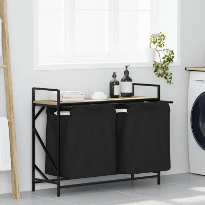 ManoManoGeneral description The laundry basket provides a spacious and convenient storage solution, featuring pull-out bags that make organizing your laundry effortless. Designed to accommodate a generous load of laundry per bag, this organizer helps categorize garments by color or fabric type, maintaining a clutter-free laundry area. It can also be used for storing toys and more. Technical specifications Frame color: Black Shelf color: Sonoma oak Laundry bag color: Black Frame material: Steel Shelf material: Engineered wood Laundry bag material: Fabric (100% Polyester) Overall dimensions: 97 x 33 x 77 cm (W x D x H) Laundry bag dimensions (each): 43.5 x 29.5 x 52.5 cm (W x D x H) Total max. weight capacity: 40 kg Max. weight capacity per shelf: 20 kg Max. weight capacity per laundry bag: 5 kg Each laundry bag includes a bottom panel for stability Assembly required: Yes Delivery contains: 2 x Laundry bag, 2 x Bottom panel, 1 x Shelf, Laundry basket frame, Assembly accessories SKU: 859076