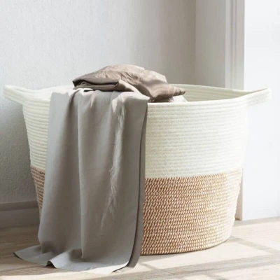 ManoManoGeneral description This laundry basket impresses with its modern design, making it not only practical but also a stylish addition to any room. Technical specifications Colour: Brown and white Material: 60% cotton, 40% polyester Dimensions: Ø60 x 36 cm (Diameter x Height) SKU: 358476 Usage Ideal for storing laundry, toys, blankets, cushions, or other household items. To maintain its shape, stuff the basket with items like pillows upon receiving it or reshape it with an iron if necessary. For cleaning, hand wash the basket gently to avoid deformation; machine washing is not recommended. Other information