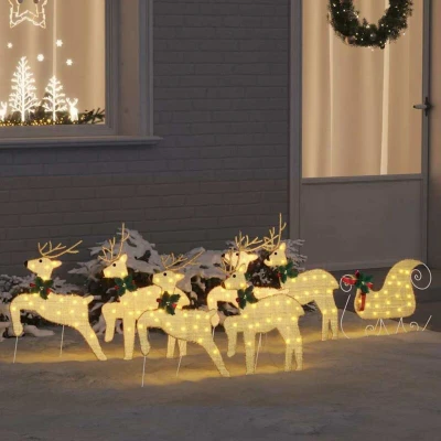 ManoManoGeneral description This Christmas Reindeer decoration is a testament to the timeless appeal of holiday traditions. Suited for both indoor and outdoor settings, it effortlessly uplifts spaces with an elegant, festive vibe. Emphasized by classic design elements, the reindeer showcases intricate artistry and combines it with modern efficiency through LED accent highlights. It's perfect for those who appreciate artistic renditions of holiday ornaments, providing a warm, inviting glow that complements the cozy, festive atmosphere of the season. Technical specifications Colour: Gold Material: Fabric Overall dimensions: 45 x 19 x 65 cm (L x W x H) Lights type: Decorative string lights Power source: USB (DC 5V) Durable Indoor / outdoor: Indoor and sheltered outdoor use Delivery contains: 6 x Reindeer, 1 x Sleigh Assembly required: Yes EAN: 8721288752635 SKU: 3385890 Brand: vidaXL Usage LED Accent Lighting: The Christmas Reindeer is adorned with LED lights designed to create enchanting