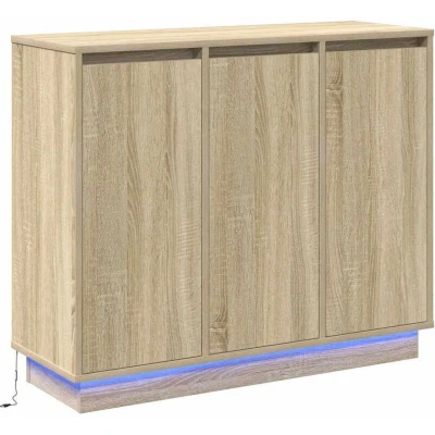 ManoManoGeneral description This Modern Sideboard is where functionality meets contemporary style, making it a brilliant addition to any home. With its rectangular shape and smooth flush doors, it stands out from the usual designs, bringing a sleek and simple look. Whether it’s in the dining room, living room, or even the bathroom, its understated elegance fits right in. The subtle LED strip lighting casts a lovely glow, turning your space into a cozy retreat while keeping all your essentials neatly stored and close at hand. Technical specifications Colour: Sonoma oak Material: Engineered wood Overall dimensions: 90 x 32 x 75 cm (L x W x H) Weight: 26.7 kg Lights type: LED strip lights With shelf With 3 doors Indoor use only Assembly required: Yes EAN: 8721158253965 SKU: 869676 Usage Perfect for storing dinnerware and decorative items. Easy to clean with a quick wipe using a damp cloth. Designed for indoor use only. Other information Use only certified DC 5V input to avoid overheating and