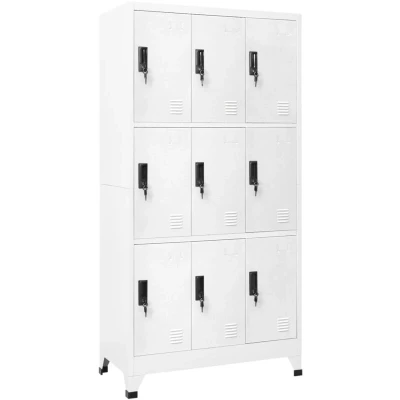 General description This locker cabinet features a modern design, making it a stylish addition to any room or office space. Constructed from durable steel, it is easy to clean and maintain. Each compartment is equipped with a lockable door that includes air vents, providing ample storage space for clothes and personal belongings. The name tag holder allows for organized sorting of items, making it suitable for schools and offices. Technical specifications Colour: White Material: Steel Dimensions: 90 x 45 x 180 cm (W x D x H) 9 lockable doors (2 keys included for each door) Loading capacity per compartment: 20 kg Total loading capacity: 180 kg Assembly required: Yes Warning: To prevent overturning, this product must be used with the wall attachment device provided Other information