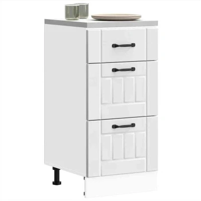 ManoManoGeneral description This kitchen base cabinet optimizes your kitchen space, providing ample storage for your personal belongings. It is designed to be stable and durable, made from engineered wood that is resistant to moisture, warping, and splitting. Technical specifications Colour: White Material: Engineered wood Overall dimensions: 40 x 46 x 81.5 cm (W x D x H) Dimensions of each drawer: 40 x 38.5 x 16/27 cm (W x D x H) Maximum weight capacity: 50 kg Weight capacity of each drawer: 5-8 kg Range name: Lucca With adjustable feet Assembly required: Yes Installation To prevent tipping, this product must be used with the provided wall attachment device. Screw(s) and plug(s) for inside the wall are not included; use suitable ones for your walls. If uncertain, seek professional advice. Read and follow each step of the instruction carefully. Usage Ample storage space for bowls, plates, pots, and other kitchen appliances. Easy to maintain with a damp cloth due to its smooth surface. Other