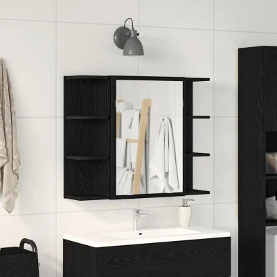 ManoManoGeneral description This wall-mounted vanity mirror cabinet cleverly combines style and practicality, making it a top choice for any modern bathroom. Its trendy design, with a natural wood finish and sleek glass surface, not only enhances your grooming area but also adds a sprinkle of class to your home decor. The cabinet features spacious storage for all your toiletries and grooming items, helping to keep everything neat and easily accessible. Made from water-resistant materials, it is perfect for bathroom use, protecting your belongings from moisture damage. Technical specifications Colour: Black oak Material: Engineered wood Overall dimensions: 80 x 20.5 x 64 cm (L x W x H) Weight: 14 kg With plane mirror With 6 shelves Indoor / outdoor: Indoor only Assembly required: Yes EAN: 8721158769015 SKU: 862498 Installation With clear instructions, putting this cabinet together is straightforward. You’ll only need a couple of friends and some basic tools, like a screwdriver, to get your