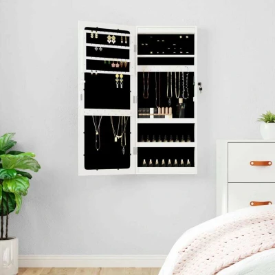 ManoManoGeneral description Keep your jewellery and perfumes discreetly and elegantly stored away with this stylish mirror jewellery cabinet with LED lights. This cabinet not only serves as a functional storage solution but also enhances your decor with its sleek design. Technical specifications Colour: White Material: Engineered wood, glass, fabric (100% polyester) Filling material: Foam Overall dimensions: 37.5 x 10 x 90 cm (W x D x H) Lockable design with 2 keys Features a frameless mirror Assembly required: Yes Installation Screws for wall mounting are included. Can be hung over the door with included hooks or mounted on the wall to save floor space. Usage This jewellery cabinet is perfect for organizing your jewellery with ample hooks, hangers, and shelves. The practical mirror allows for easy makeup application and getting ready. Other information Convenient LED lights located at the top inside automatically turn on when the door opens, helping you find your jewellery. Requires 3 AA