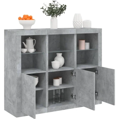 vidaXL Modern Concrete Grey Engineered Wood Sideboards with LED Lights 3 Piece Set, Ample Storage, Decor Display Function