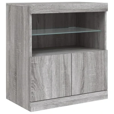 ManoManoGeneral description Enhance your living space with this modern sideboard featuring LED lights. Its sleek design allows it to seamlessly blend with various furniture styles, making it a versatile addition to any room. Technical specifications Material: Engineered wood, glass Colour: Grey sonoma Dimensions: 60 x 37 x 67 cm (W x D x H) Power: DC 5V (USB power source not included) Assembly required: Yes Usage Ample storage space for magazines, books, remote controls, and other small items. Sturdy top ideal for displaying decorative objects, photo frames, or potted plants. Equipped with vibrant RGB LED lights that can be customized for different colors and settings. Other information Warning: To prevent tipping, use the provided wall attachment device. Do not use this item if any components are broken, torn, or missing. Higher voltage may cause overheating and potential fire risks. Images: