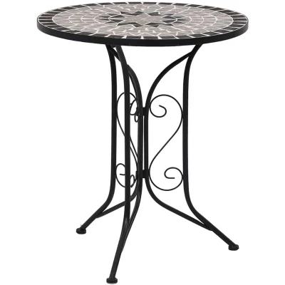 General description This mosaic bistro table is an excellent addition to your balcony or garden, perfect for serving as a coffee table to hold your drinks or other essentials. Its sturdy powder-coated iron frame ensures durability, while the ceramic tabletop is easy to clean. Technical specifications Colour: Black and grey Material: Powder-coated iron frame + ceramic tabletop Dimensions: 61 x 71 cm (Diameter x H) Other information Note: It is not suitable to be left outside in cold conditions SKU: 46715