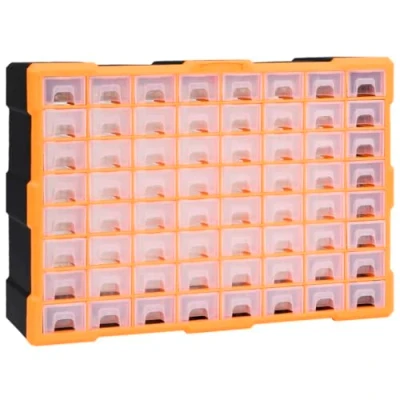 General description This must-have multi-drawer organiser features a total of 64 drawers, designed for neatly storing a wide variety of items. It is ideal for organizing hand tools and accessories such as fasteners, and can also be used as a sewing or nail box. The drawers are made of see-through plastic, allowing for quick identification of contents. This craft box is perfect for storing nuts, bolts, screws, nails, general fixings, and components. The unit can be wall-mounted or used individually as a tool organiser. Technical specifications Colour: Orange and black Material: PP (Polypropylene) Overall dimensions: 52 x 16 x 37.5 cm (L x W x H) Small drawer dimensions (each): 5.7 x 15.6 x 3.8 cm (W x D x H) Assembly required: No Other information