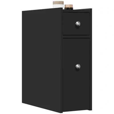 ManoManoGeneral description This classic narrow bathroom cupboard is a decorative and practical addition to your home. It provides ample storage space to keep your daily essentials well organized and protects your items from dust and dirt. The cupboard features quality metal runners and elegant handles for smooth movement, making it easy to access your stored items. With two wheels, it can be easily relocated to suit your needs. This versatile cupboard can be used in the bathroom, kitchen, or living room as a storage or drawer cabinet. Technical specifications Colour: Black Material: Engineered wood Overall dimensions: 21.5 x 50 x 60 cm (W x D x H) Drawer dimensions: 18 x 42 x 42 cm (W x D x H) Top drawer dimensions: 18 x 18.5 x 13 cm (W x D x H) With two wheels Loading capacity of top shelf: 20 kg Loading capacity per drawer: 8 kg Overall loading capacity: 50 kg Assembly required: Yes SKU: 855287 Installation To prevent tipping, this product must be used with the provided wall attachment