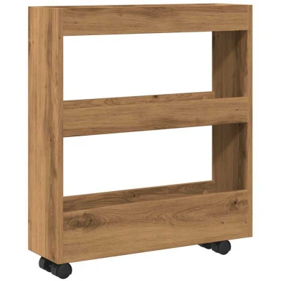 General description This narrow storage trolley is a decorative and practical addition to your home. It provides ample storage space for keeping your various daily essentials well organized and within easy reach. The slim design allows it to fit in small spaces, making it suitable for use in the living room, kitchen, or bathroom. Technical specifications Colour: Artisian oak Material: Engineered wood Overall dimensions: 60 x 18 x 70 cm (W x D x H) Shelf dimensions: 57 x 15 x 7/13 cm (W x D x H) Number of wheels: 4 (2 have brakes) Loading capacity per shelf: 15-20 kg Overall loading capacity: 60 kg Assembly required: Yes Installation Assembly required: Yes Usage Ideal for organizing daily essentials in various rooms such as the living room, kitchen, or bathroom. Easy to move with four swivel wheels; two of which are lockable for added stability. Other information