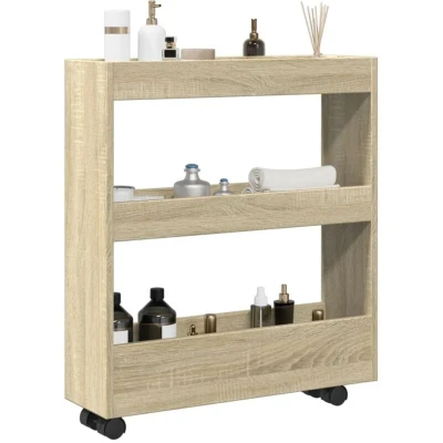 VidaXLThis narrow storage trolley is meant to be a decorative and practical addition to your home. Stable and durable material: Engineered wood is a durable and stable material with a smooth surface that is resistant to moisture, warping, and splitting, making it a reliable choice for a variety of projects.Ample storage space: The slim storage trolley provides ample storage space for keeping your various daily essentials well organised and within easy reach.Easy to move: This rolling cart, with the included four swivel wheels, can be easily moved to the desired place. The two wheels are lockable, which keeps the cabinet in position and adds stability.Wide applications: Depending on your needs, you can use this storage trolley in the living room, kitchen, or bathroom thanks to its narrow shape, even in small spaces.