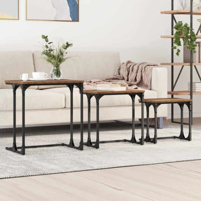 ManoManoGeneral description These Industrial Nesting Coffee Tables offer a dynamic blend of style and functionality, making them the perfect addition to any modern living space. With their sleek, rectangular shape and robust design, these tables fuse urban practicality with contemporary elegance. The set comprises three tables, crafted to fit seamlessly under one another, providing a space-saving solution that is aesthetically versatile and perfect for various occasions. The textured, matte finish and black steel frame give these tables a distinctive and bold look, making them an ideal centerpiece in any living room. Technical specifications Colour: Old wood Material: Engineered wood Overall dimensions: 50.5 x 35 x 53 cm (W x D x H) Assembly required: Yes EAN: 8721288900159 SKU: 883531 Brand: vidaXL Usage The set includes three tables that slide neatly under one another, allowing users to free up space or expand when entertaining guests. Each table serves a unique purpose, from hosting drinks