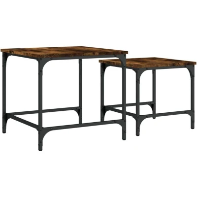 ManoManoGeneral description These two nesting coffee tables are a smart solution for small living spaces or any area with limited room. With an industrial design, this coffee table set adds a chic touch to your living room, bedroom, or office. Technical specifications Colour: Smoked oak Material: Engineered wood, metal Large coffee table dimensions: 50 x 50 x 46 cm (W x D x H) Small coffee table dimensions: 40 x 40 x 38 cm (W x D x H) Max. load capacity per table: 45 kg Assembly required: Yes Usage The nesting coffee table set is versatile and can be used as a nightstand in the bedroom, a side table, or a couch table in the living room and office. Other information Delivery contains: 1 x Large coffee table 1 x Small coffee table