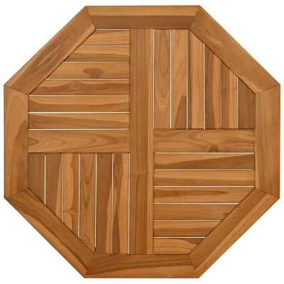 General description Give a new life to your garden table with this wooden table top. It is an excellent solution for freshening up your table. Made from solid teak wood, this table top is a beautiful natural material known for its exceptional strength and weather resistance. The smooth surface has been seasoned, kiln dried, and fine sanded for a refined appearance. Technical specifications Material: Solid teak wood with water-based finish Dimensions: 70 x 70 x 2.5 cm (L x W x T) Shape: Octagonal SKU: 366665 Compatibility and accessories Can be combined with different bases according to your needs Includes a parasol hole for easy attachment of a parasol Usage The smooth tabletop is easy to clean with a damp cloth, making it practical for outdoor dining. Its rustic design adds charm to your dining areas. Other information Each item is unique with variations in colors and grains, ensuring exclusivity and individuality.