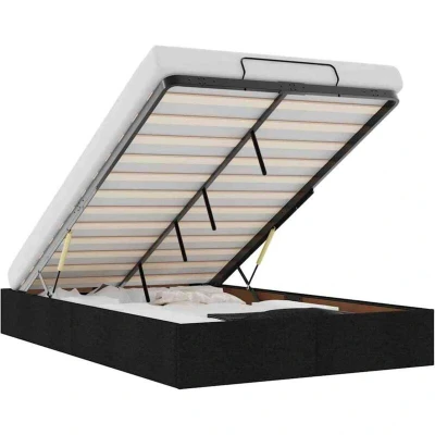 ManoManoGeneral description This ottoman bed frame seamlessly blends modern aesthetics with practical functionality, offering you both a storage solution and a comfortable sleep experience. The soft and durable polyester fabric ensures ultimate comfort and coziness, while the spacious under-bed storage maximizes your space without requiring additional floor area. This bed frame is ideal for smaller or more confined spaces, providing ample room for storing items such as extra duvets, pillows, and seasonal clothing. Technical specifications Colour: Black Material: Fabric (100% polyester), metal, plywood, engineered wood Overall dimensions: 193 x 135 x 23.5 cm (L x W x H) Suitable mattress size: 135 x 190 cm (Double) (mattress not included) Max. weight capacity: 280 kg Assembly required: Yes Compatibility and accessories A mattress is not included with this bed. Various selections of mattresses are available in our shop. Installation Assembly required: Yes Usage The integrated hydraulic lift